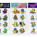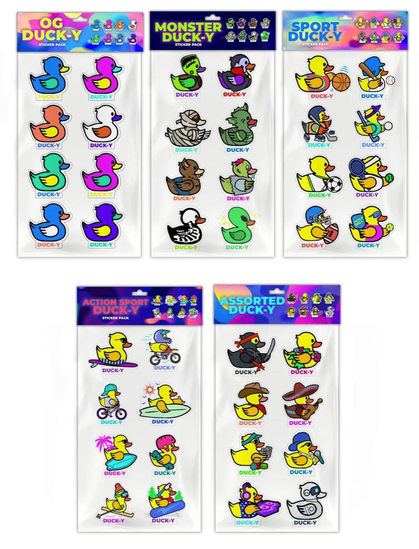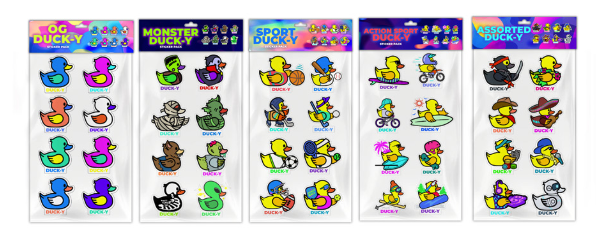 DUCK-Y Sticker Packs Display. Each display comes with 5 different DUCK-Y sticker packs x 10 units each. Each sticker pack has 8 different DUCK-Y characters on the sheet.