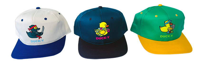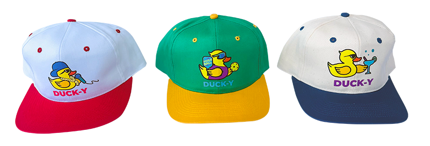 DUCK-Y 2 tone Cotton Hats - 3 pack. **This is a mystery pick! You will get 3 different DUCK-Y hats sent in each 3 pack. Each 3 pack will have different DUCK-Y characters and different colors of hats.